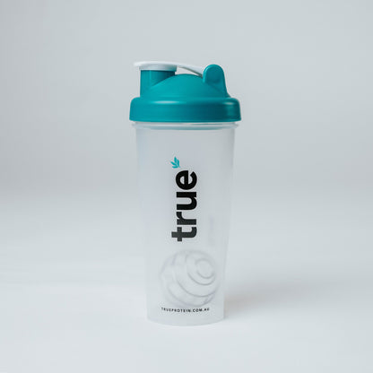 True Protein large clear plastic protein shaker bottle with teal screw-on flip lid, embossed mixing ball visible, vertical "true" logo — Australia (trueprotein.com.au)
